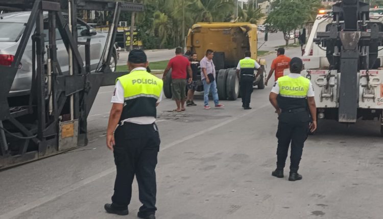 Playa del Carmen (Macropolis QR).- Sobre la avenida 41 sur un tráiler que pasaba sobre un paso peatonal raspó la “madrina” de su tráiler y ocasionó que las mangueras del aire se reventaran y se zafara la caja del tráiler.