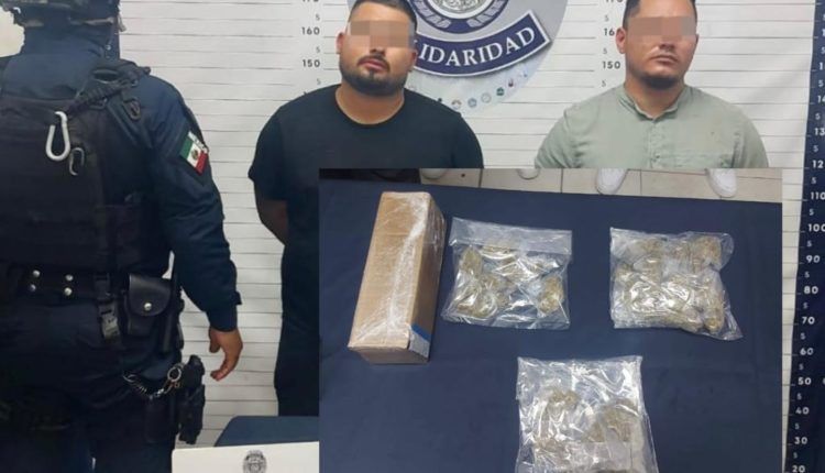 Playa del Carmen.- Dos sujeto fueron asegurados en posesión de posible marihuana durante el recorrido de vigilancia permanente realizan policías de la Secretaría de Seguridad Pública y Tránsito Municipal de Solidaridad en la colonia Colosio de esta ciudad.