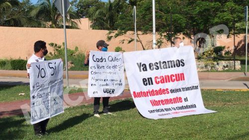 Cancún, Quintana Roo, 8 de diciembre 2020.- Un grupo de al menos 30 operadores de Uber se manifestaron la mañana de hoy en la glorieta El Ceviche, en donde exhibieron una denuncia por asociación delictuosa en contra de taxiata y agentes de Tránsito, quienes están coludidos para hostigarlos para detenerlos.
