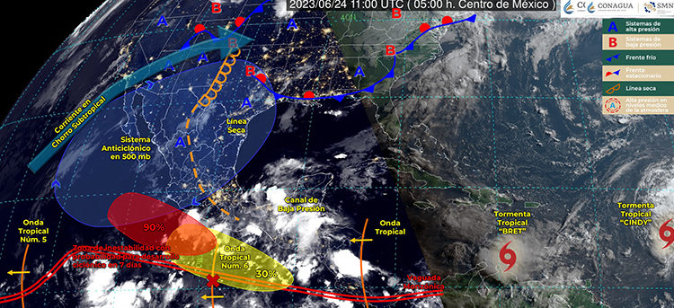 Playa del Carmen (Macropolis QR).- Este día, canales de baja presión, uno en el sureste de México y otro sobre la Península de Yucatán, en interacción con el desplazamiento de la onda tropical número 6 al sur de las costas de Oaxaca, así como con la entrada de humedad del Mar Caribe y Golfo de México, originarán lluvias puntuales torrenciales en zonas de Chiapas y Tabasco.