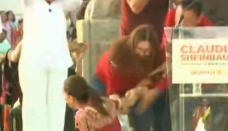 Uno, dos, tres brinquitos, hasta que la descoordinación de ambas provocó que Sheinbaum tropezara hacia su costado izquierdo con el piso del templete.