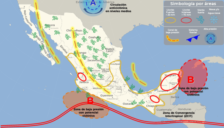 Asimismo, una segunda zona de baja presión con probabilidad de desarrollo ciclónico, se desplazará frente a las costas de Guerrero y Michoacán, su amplia circulación ocasionará lluvias muy fuertes a puntuales intensas en el occidente y sur de México.