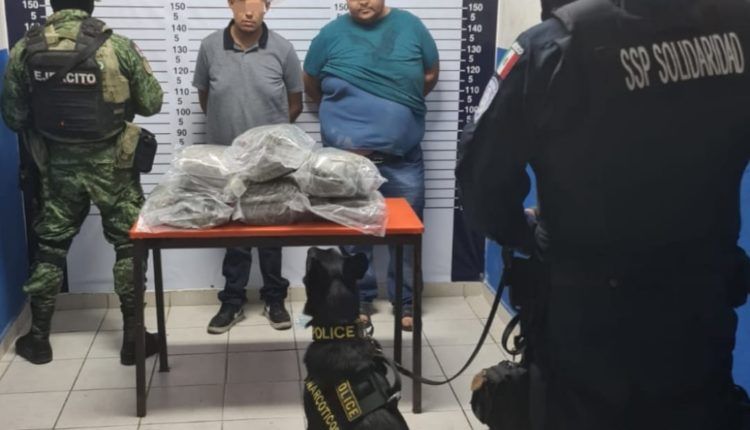 Playa del Carmen.-La policía municipal de Solidaridad y elementos de la Secretaría de la Defensa Nacional, aseguraron a dos sujetos en posesión de 6 paquetes con posible marihuana en el puesto de inspección preventiva ubicado en la carretera federal Playa del Carmen – El Tintal.