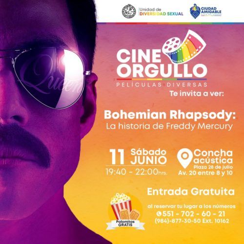 Dentro de las actividades, todos los sábados los solidarenses y turistas podrán disfrutar de la cartelera de Cine Orgullo, con palomitas y boletos gratis en la concha acústica de la plaza 28 de Julio en dos horarios: de 19:40 hrs. y 22:00 hrs. con reservación al 551-702-60-21 o al 8984)8773050 ext. 10162. Esto, teniendo como marco de fondo el palacio municipal que se vestirá con los colores de la bandera de la comunidad LGBTTTIQ+.