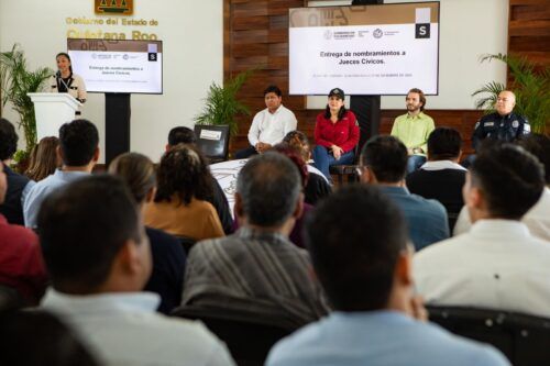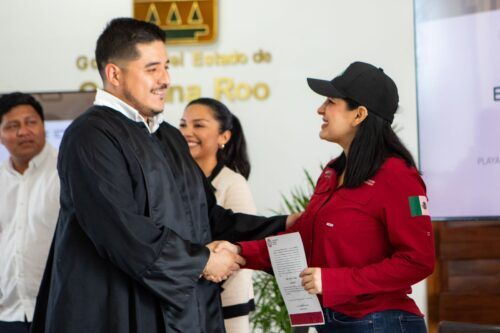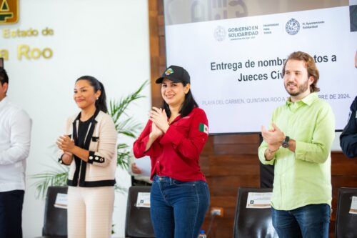Playa del Carmen.— La Justicia Cívica es la herramienta clave para prevenir conflictos, fortalecer el tejido social y construir un Solidaridad más justo y ordenado, dijo la presidenta municipal Estefanía Mercado, en la entrega de siete nombramientos a juezas y jueces cívicos, en el salón “Leona Vicario”, en el nuevo Palacio Municipal.