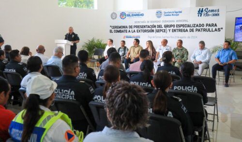 Playa del Carmen. – La presidenta municipal Lili Campos, presentó al Grupo Especializado para el Combate a la Extorsión (GEPCE) de la Secretaría de Seguridad Ciudadana Municipal de Solidaridad, e hizo entrega de uniformes y siete unidades equipadas, como parte de la estrategia de seguridad y construcción de paz, a fin de brindar a los solidarenses una Policía Municipal especializada, digna, moderna, equipada y eficiente.
