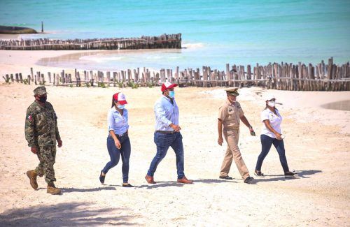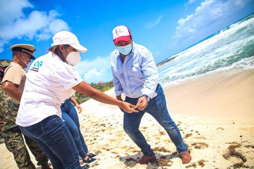 Isla Mujeres, Quintana Roo, 28 de agosto de 2020.– El presidente municipal de Isla Mujeres, Juan Carrillo Soberanis, acompañado del coordinador de la estrategia para la atención del sargazo en Quintana Roo, contralmirante de la Secretaría de Marina, Enrique Flores Morado, de la coordinadora de vinculación y enlace del gobierno estatal, Mariana García Pérez y del Capitán de Navío Isaías Vadillo Rosales, recorrió y constató que los balnearios del destino se encuentran libres de las algas pardas.