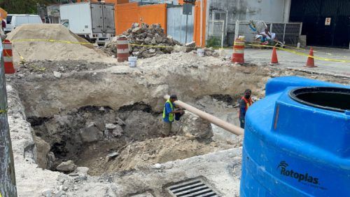 Playa del Carmen. – En día comenzaron los trabajos para rellenar el socavón que se produjo en la colonia Centro de Playa del Carmen debido al deslave que sufrió esta zona por las constantes lluvias, informó el subsecretario de Infraestructura y Obras Públicas, Fabián Herrera Quiam.