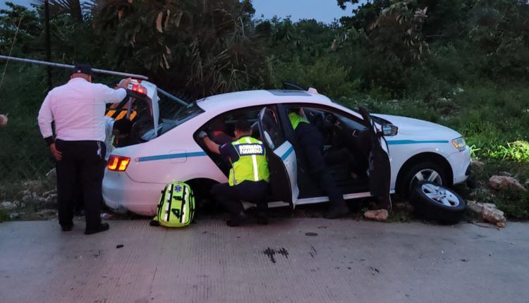 Playa del Carmen.- Aparatoso accidente se registró sobre la carretera federal 307 en dirección a Tulum, cuando el conductor de un taxi del Sindicato Lázaro Cárdenas del Río, perdió el control al volante por circular a exceso de velocidad y pasar sobre un charco de agua.