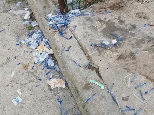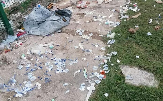 Campeche, a 29 de julio de 2021.- Una cibernauta denunció en redes sociales que en un acto de irresponsabilidad fueron arrojadas jeringas usadas para aplicar las vacunas anti Covid-19 afuera de un foro de Campeche.