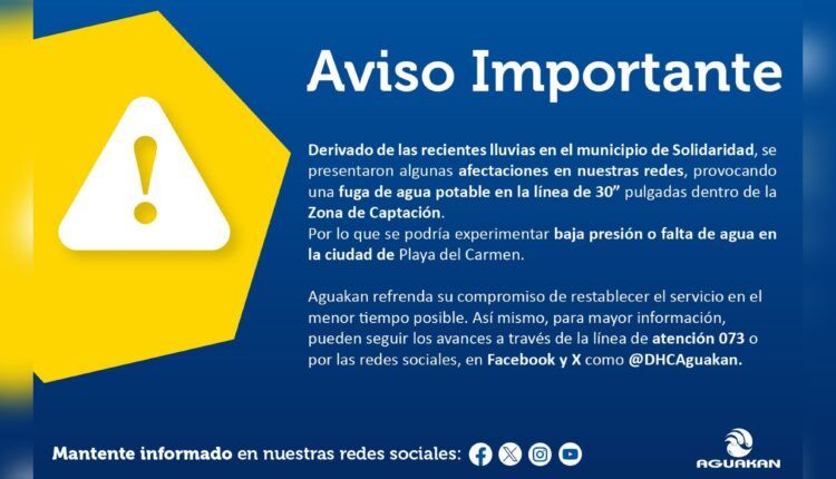 Playa del Carmen. – Derivado de las recientes lluvias en el municipio de Solidaridad, la empresa Aguakan informó que se han presentado afectaciones en las redes de distribución de agua potable.