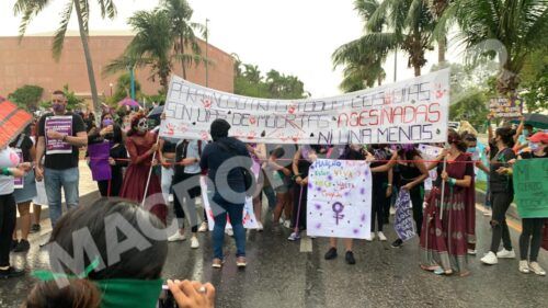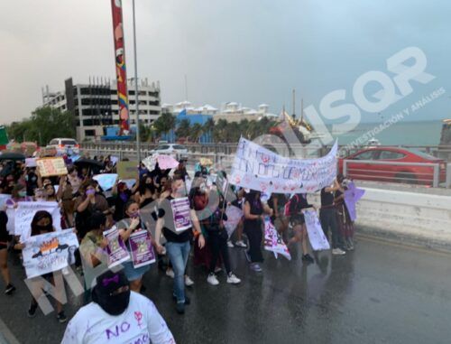 Cancún, Quintana Roo, 8 de marzo 2021.- Tras mantener el paso sobre el bulevar Kukulcán, el contingente las mujeres pertenecientes a diversos colectivos que se manifestaron en la marcha feminista por el Día Internacional de la Mujer, que inició desde el kilómetro 3 de la zona hotelera, causan afectaciones a los automovilistas y transportistas que se mantuvieron a vuelta de rueda, debido al cierre de circulación vial y a las inclemencias del tiempo.