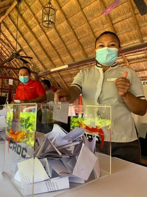 Playa del Carmen, Quintana Roo, 29 de marzo de 2021.- Las y los trabajadores del complejo hotelero Barceló, uno de los más grandes de México, participaron en la consulta democrática en la que con su voto libre, personal, directo y secreto decidieron continuar con su Contrato Colectivo de Trabajo (CCT), validando así la legitimación del mismo.
