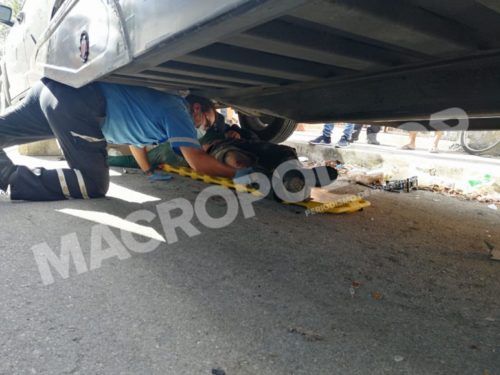 Cuando los paramédicos llegaron no podían sacar al joven diligenciero de la refaccionaria Quintal, por lo el operador de una grúa de la empresa Quality tuvo que hacer una maniobra para levantar la camioneta y y poder brindarle los primeros auxilios al conductor de la motocicleta.