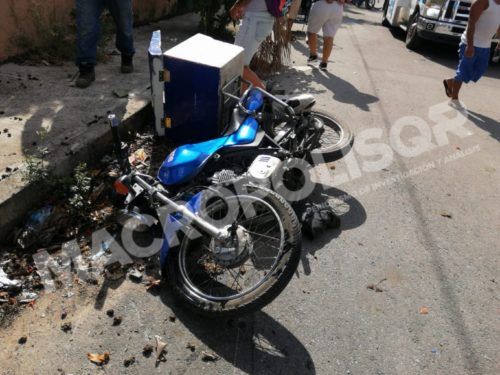 Playa del Carmen, a 16 de julio de 2021.- Trágico accidente de tránsito se registró sobre la calle 1 sur en la colonia Ejidal, cuando el conductor de una camioneta arrolló a un repartidor de una motocicleta, diligenciero de una refaccionaria pereciendo de manera instantánea, para liberar el cuerpo fue necesaria la intervención de una grúa de la empresa Quality.