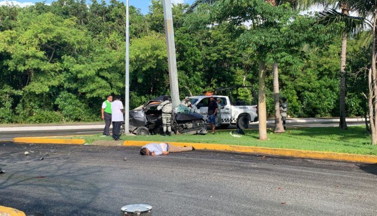 La mañana de este lunes se registro el accidente justo en el kilómetro 25 del boulevard Kukulcán, cerca del parque acuático Ventura Park, donde al parecer el chófer del auto compacto intentó tomar a gran velocidad la curva y a consecuencia perdió el control de su unidad que se impactó contra un poste del camellón central.