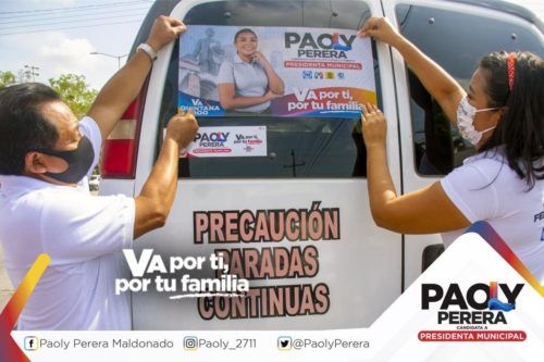 En la colocación de la propaganda de la candidata por la alianza de los partidos PAN, PRI, PRD Y CxQ, se sumaron automovilistas que pidieron también ser portadores de los microperforados como apoyo a Paoly Perera.