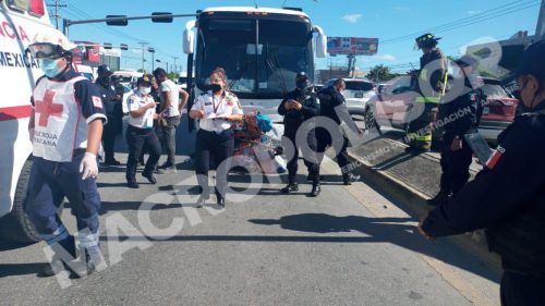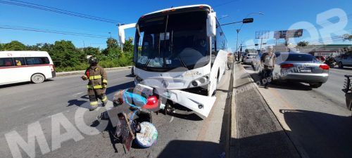 Cancún, Quintana Roo, 28 de diciembre 2020.- Un vendedor de Bon Ice que circulaba a bordo de una motocicleta fue atropellado por el conductor de un autobús de la empresa Yellow Online Bus marcado con el número económico 166, cuando transitaba por la Región 105, a la altura de la avenida Lakin con López Portillo.