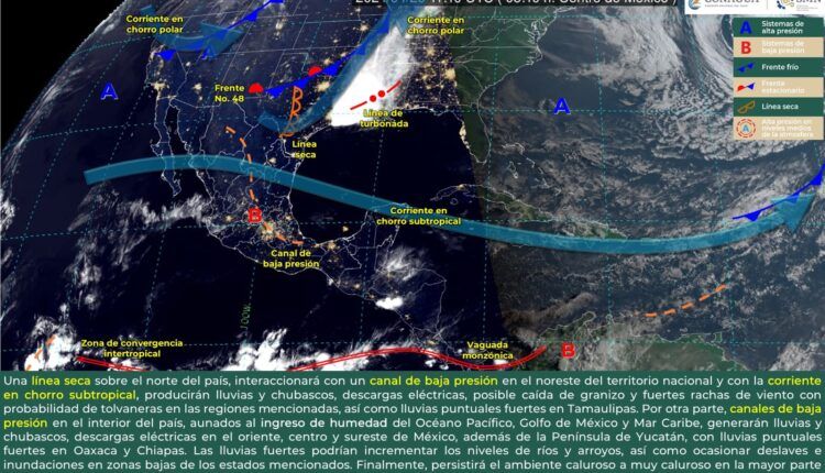 De acuerdo con el primer reporte del organismo, habrá lluvias muy fuertes con posible caída de granizo y descargas eléctricas en Tamaulipas, Oaxaca y Chiapas, donde además se esperan algunos encharcamientos; también hay pronóstico de chubascos y lluvias aisladas en Coahuila, Nuevo León, San Luis Potosí, Querétaro, Hidalgo, Puebla, Tlaxcala, Veracruz, Tabasco, Campeche, Yucatán y Quintana Roo.