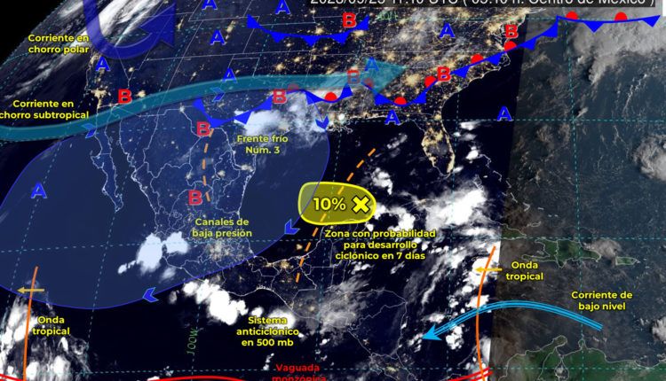 El frente frío número 3 se extenderá sobre el norte del territorio nacional, y aunado a inestabilidad en niveles altos de la atmósfera, propiciarán lluvias puntuales muy fuertes en Coahuila, así como lluvias puntuales fuertes en Chihuahua, las cuales podrán acompañarse de fuertes rachas de viento, caída de granizo, así como probabilidad para formación de torbellinos, principalmente en la porción norte de Coahuila, Nuevo León y Tamaulipas.